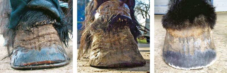 An den Hufen dieses Friesen kann man massive Stoffwechsel Probleme und stark deformiertes Wandhorn erkennen. Dieser jahrelang andauernde Zustand sorgte für tiefe Risse und leider auch für irreparable Schäden am Hufbein. Trotzdem konnte wieder eine akzeptable Hufform erreicht werden und damit die weitere Schädigung gestoppt werden. Ansicht beider Hufe mit Eisen, nach Abnahme und ein Jahr später. Das vorher lahme Pferd konnte mit Hufschuhen wieder normal geritten werden.