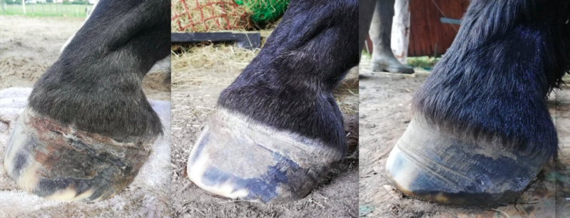 Aber die Besitzerin hat nicht aufgegeben und dank der richtigen Bearbeitung in kurzen Abständen (am Anfang sogar wöchentlich), täglich neuem Polsterverband und vor allem durch den Austausch des Schmerzmittels gegen Weidenrinde konnte in kurzer Zeit schon eine deutliche Verbesserung erzielt werden. Durch das Zusammenspiel aller Maßnahmen konnte der Huf fast ohne die typischen Verformungen nachwachsen. Das Pferd war bereits nach einem knappen Jahr komplett genesen und erfreut sich noch heute bester Gesundheit.